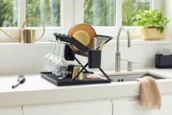 Op dit inklapbare Brabantia Sink Side Afdruiprek – Dark Grey met lekbak kun je al je borden, pannen en glazen kwijt – zelfs je breekbare wijnglazen. De bakjes voor bestek en keukengerei zijn afneembaar. Handig voor transport en bij het inklappen en opruimen van het rek. Een lekker rek dus, mooi genoeg om op je aanrecht te laten staan, maar ook makkelijk en klein op te bergen.
