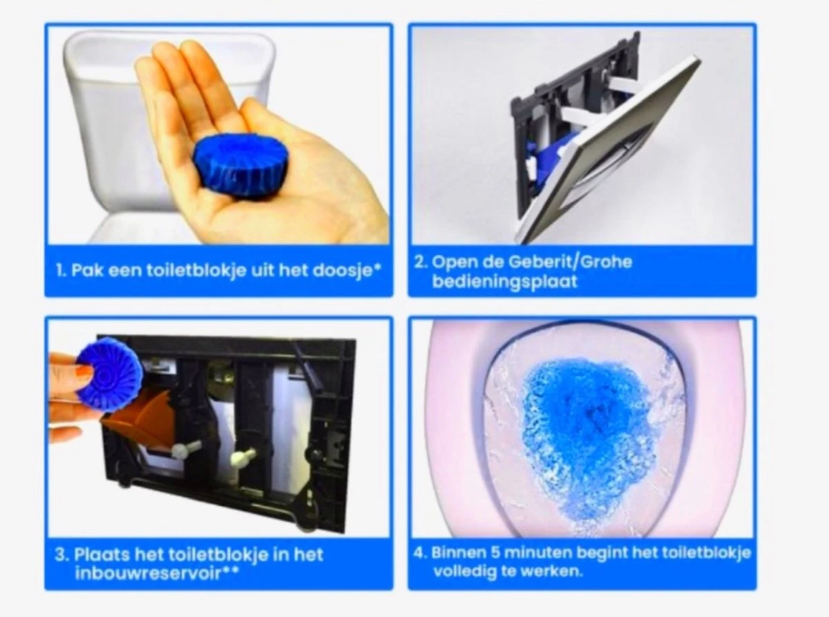 Wil je graag één super schoon en frise Toilet? ben je klaar met zelf te kuisen? dan is dit zeker iets voor u! De toiletblokjes gaan 4 weken mee en bevatten eco-vriendelijke pigmenten. De knal blauwe blokjes werpt u in de toilet inbouwreservoir. Ze komen automatisch terecht in het reservoir en u hoeft niet meer te klungelen met toiletblokjes die in uw pot hangen. Vaak valt het toiletblokje dat in uw pot hangt in het toilet en het vervangen is vaak geen smakelijk klusje.