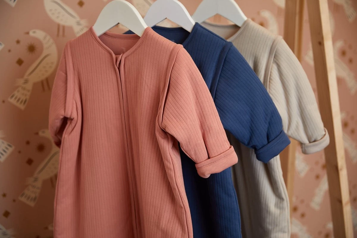 De slaapzak is verkrijgbaar in de kleuren nougat, jeans blue en rosewood (roze)