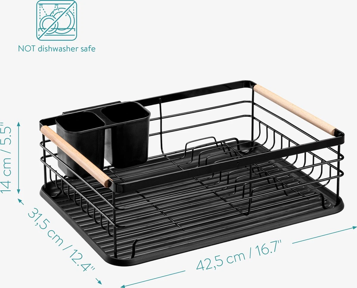 - DETAILS: Je ontvangt een afdruiprek van kunststof, metaal en beukenhout in de afmetingen 42,5 x 31,5 x 14 cm. De losse lekbak is makkelijk leeg te maken. Wordt geleverd inclusief uitneembare bestekhouder.