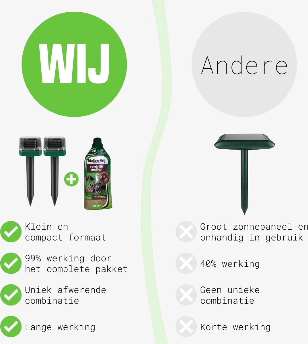 Heb jij altijd al lekker in de tuin willen zitten zonder tegen al die molshopen aan te kijken? Met deze unieke combinatie van ultrasone verjager op zonne-energie en mollen granulaat bent jij gegarandeerd van je mollen af! Na deze unieke combinatie is ruim 2 jaar onderzoek gedaan. Er was geen enkel product op de markt dat zo goed werkt als deze combinatie! De mollen worden verjaagd door middel van ultrasoon geluid.