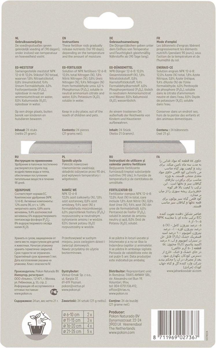 Jouw kamerplant verdient het allerbeste en dat is precies wat je in huis haalt met Pokon voedingsstaafjes. Deze meststaafjes zijn speciaal voor groene planten ontwikkeld en zorgt voor sterke planten! Onder invloed van temperatuur en water geven de staafjes geleidelijk plantvoeding af. In 1 staafje zit voldoende voeding voor 90 dagen.